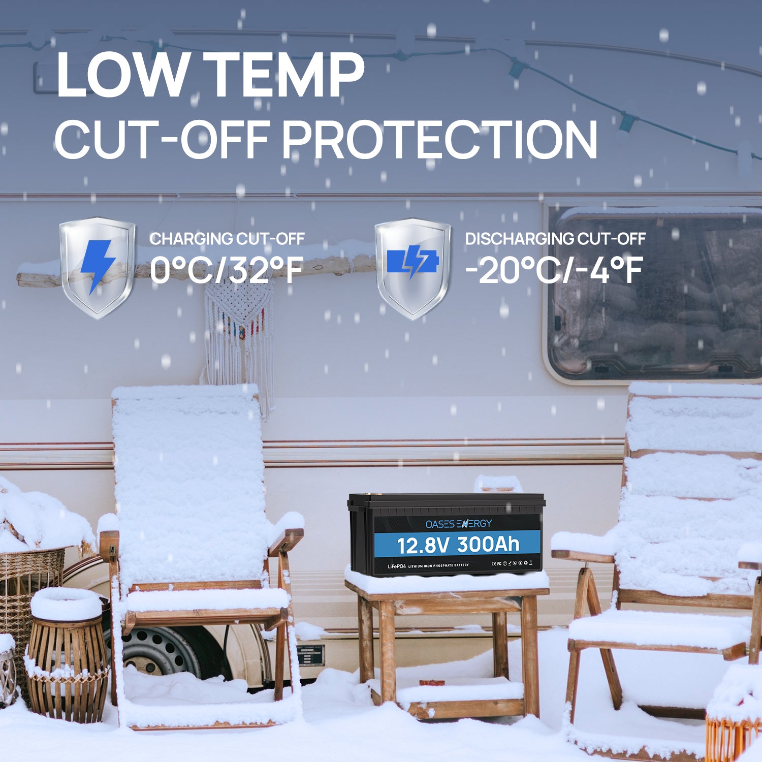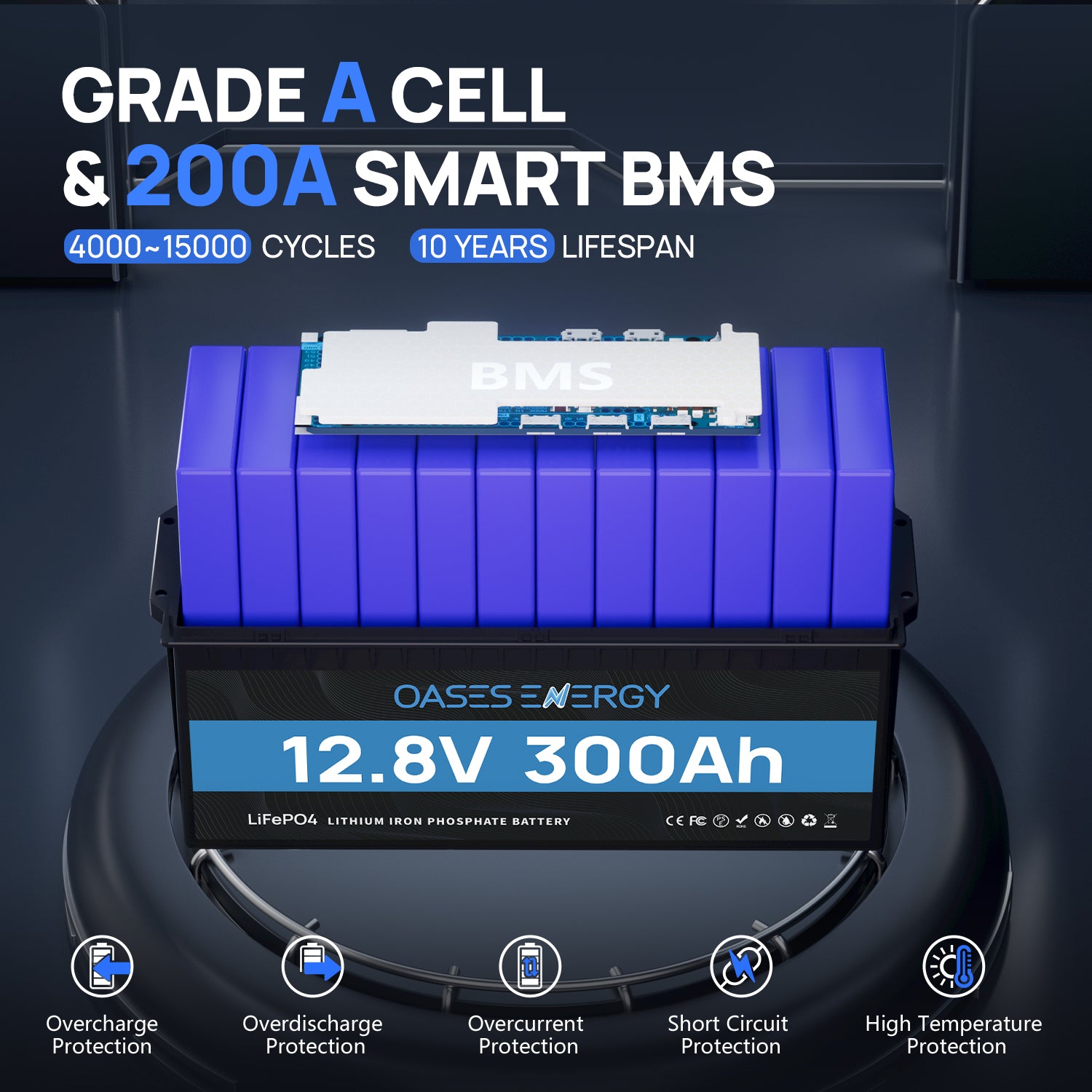 【High performance LiFePO4 battery】The 12V 300Ah lithium iron phosphate battery from Oasesenergy uses premium A cells, an integrated 200A BMS with higher energy density, more power, more stability and more safety. The integrated high temperature and low temperature shutdown prevents irreversible damage. It is allowed to work at -20℃~55℃ and charge at -5℃~55℃.