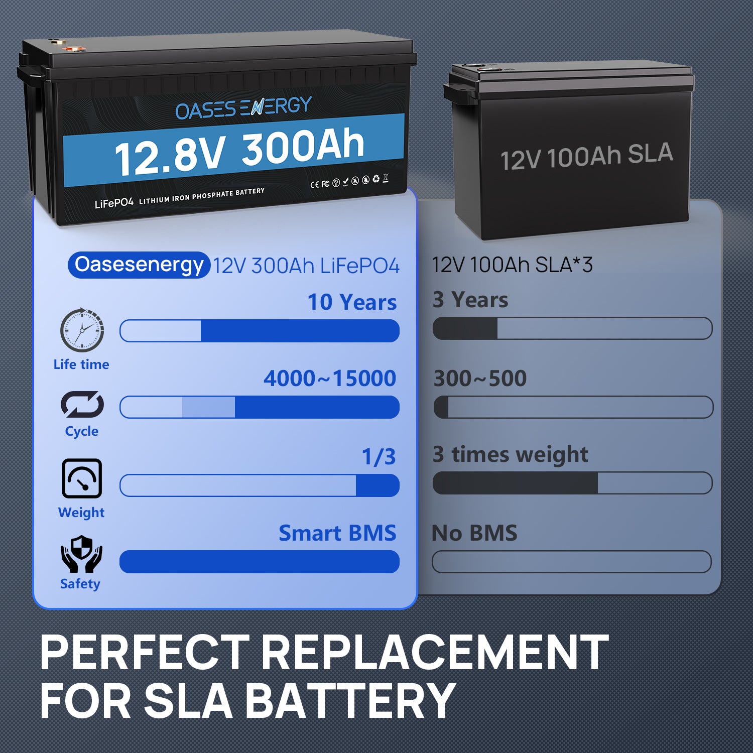 【200A BMS Protection】Oasesenergy rechargeable 12V 300Ah lithium battery is equipped with a superior 200A BMS and a Class A cell, ensuring consistent and long-lasting performance. It offers 4,000 ~15,000 cycles, which is more than 10 times that of an SLA battery. It weighs only 1/3 of a comparable lead-acid battery with the same capacity, making it easy to handle and transport.